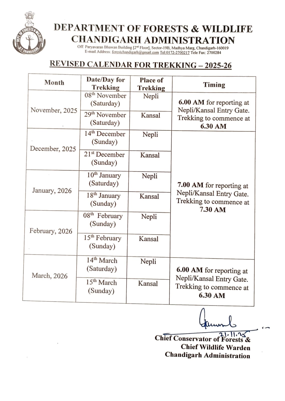 Due to administrative reasons, the Sukhna Wildlife Sanctuary will remain closed until further order