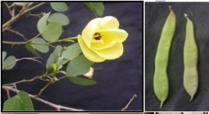 A large shrub or small tree. Bark grey. Leaves 4-7 cm across, a little broader than long, deeply cleft with a bristle at the cleft; lobes obtuse at the apex, truncate or subcordate base, 7-9-nerved. Flowers usually in pairs, yellow, on axillary or leaf-opposed peduncles. Pod 10-13 cm long, light-brown. Seeds 8-12. |